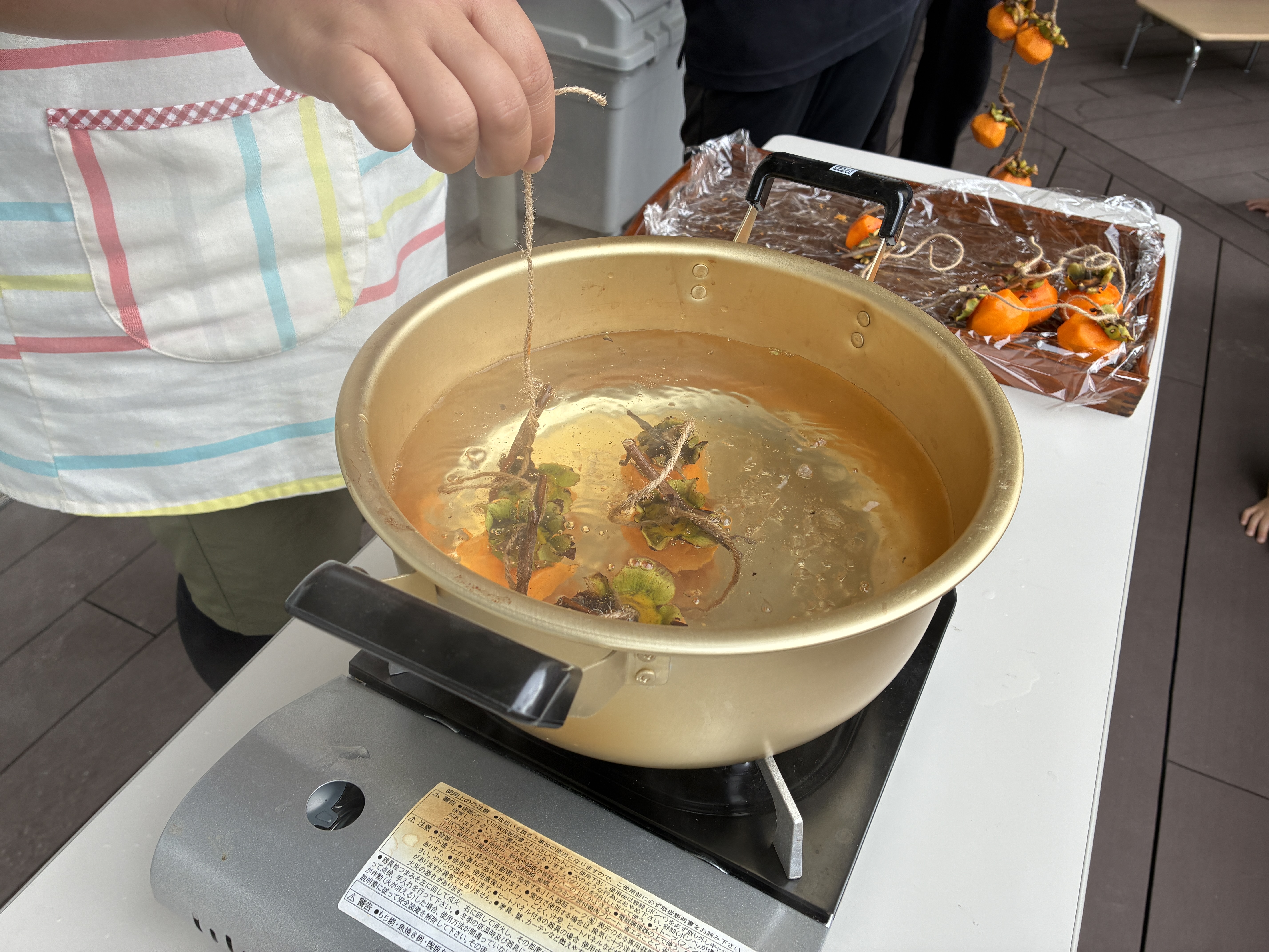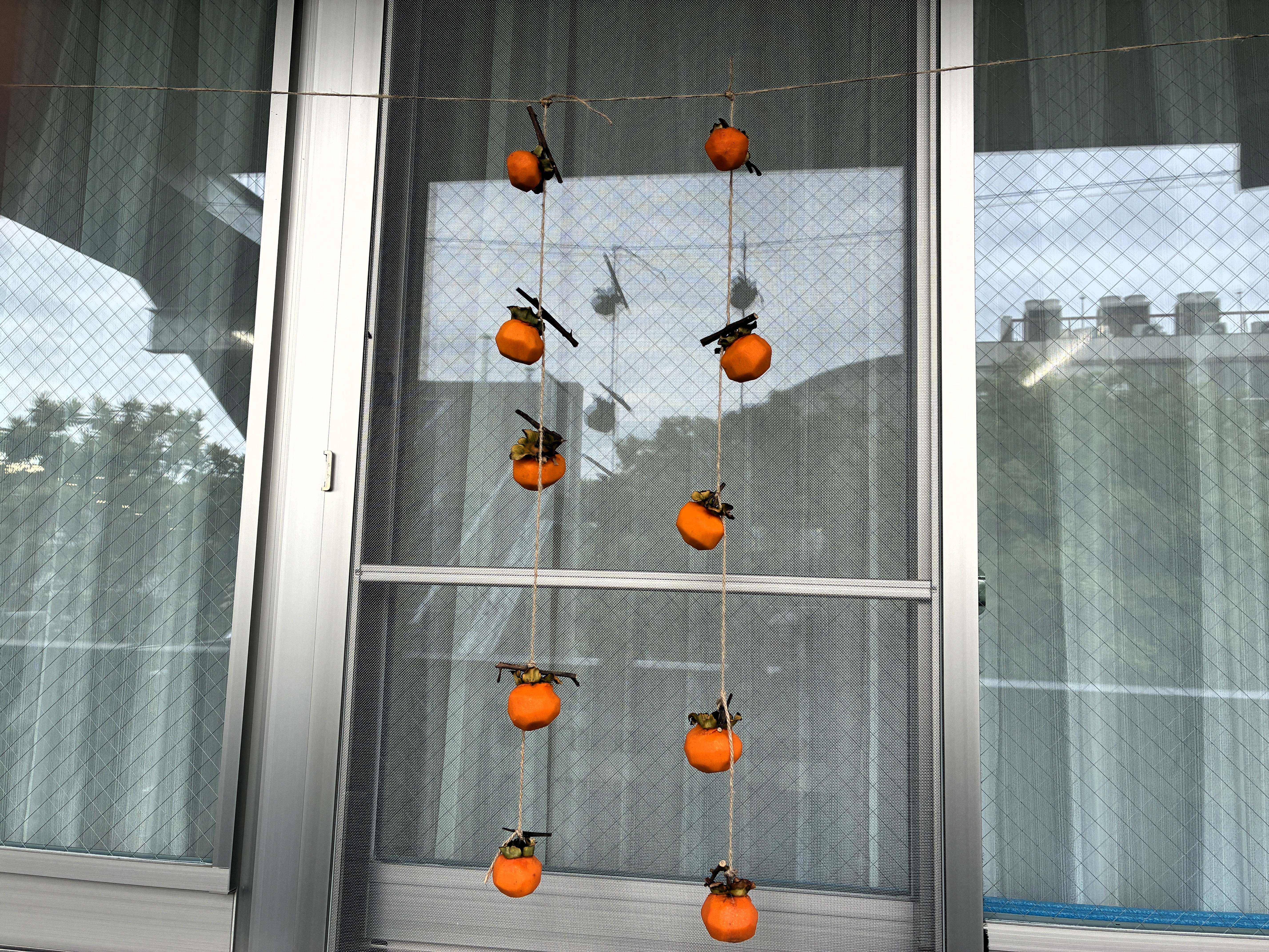 消毒した柿は風の当たる場所に干して、甘くなるのを待ちます。